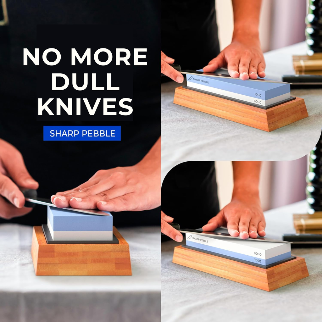 Most people let their knives go dull because they fear ruining them. We fixed that. The Sharp Pebble System combines a rigid Bamboo Anchor with a Fail-Safe Guide to ensure your blade remains stable and your angle remains perfect—stroke after stroke.