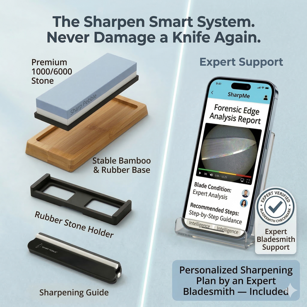 Most people let their knives go dull because they fear ruining them. We fixed that. The Sharp Pebble System combines a rigid Bamboo Anchor with a Fail-Safe Guide to ensure your blade remains stable and your angle remains perfect—stroke after stroke.