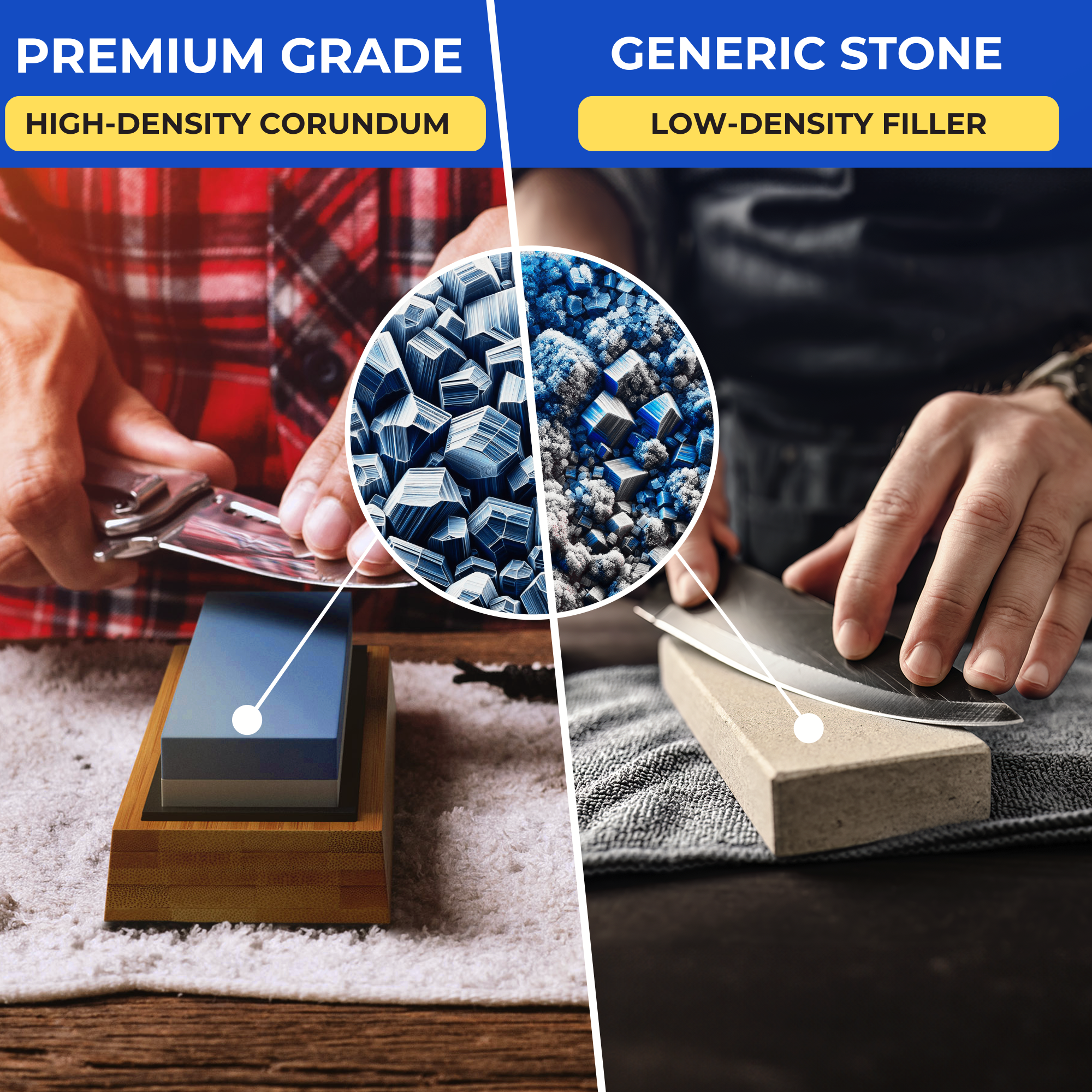 Your knife is only as good as the abrasive that touches it. As the magnification shows, generic stones (Right) rely on cheap binders and loose fillers that crumble under pressure, creating erratic scratches and 'dishing' the stone rapidly.